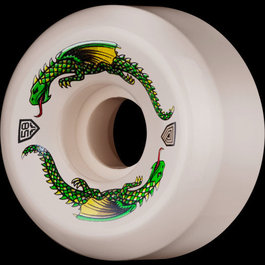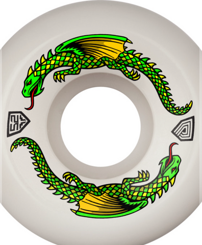 About Dragon Formula: The amazing new Dragon Formula™ (DF) Urethane used to create these wheels is another industry leading innovation from Powell • Peralta. DF-93A Dragons will not only roll over rough terrain, but also grip and slide like 99A and 101A wheels do, so that you can do all your normal tricks and more on the greater range of skate terrains made skateable by its softer 93A hardness.