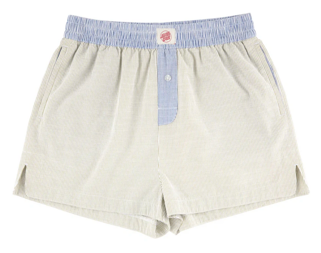 The Santa Cruz Opus Dot Lounge women's regular fit Lightweight Shorts feature small woven Santa Cruz logo on front, elastic waist, front button fly closure, and side seam pockets. Matches with Opus Dot Lounge shirt.