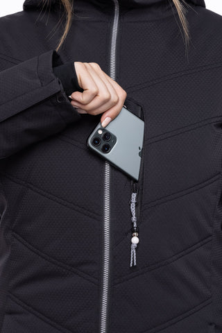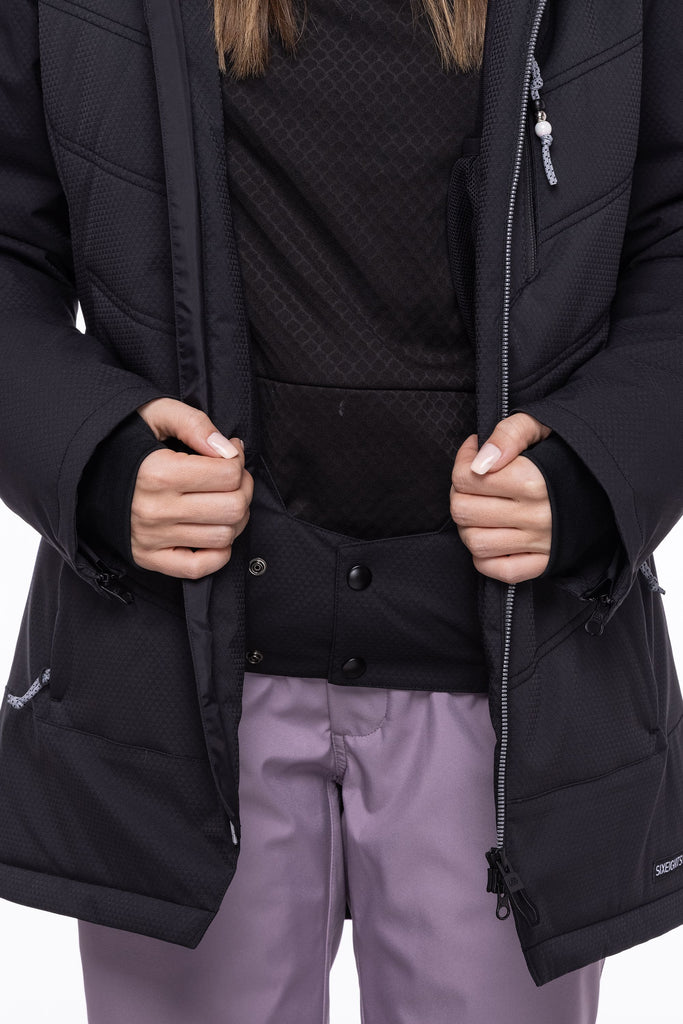 infiDRY® 10K | 10K Waterproof / 10K Breathable – This membrane blocks water, snow and wind from entering your garment, and is hydrophilic on the inside - attracting any moisture inside your jacket (sweat) and moving it through to the outside of the fabric where it is able to evaporate, thus keeping you both dry and warm.